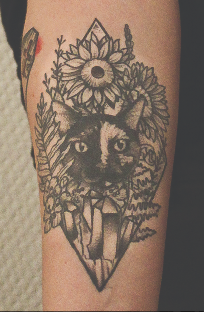 Natalie Dean: I chose this tattoo because my cat, Penny, is nearly 14 years old and I know I won’t have her forever, so having a piece of her means a lot. I got rosemary sprigs for my grandmother, Rosemary, as well as my May birth flowers (Hawthorns). I also got sunflowers because I grow them in the summer — I wanted things that brings me joy.