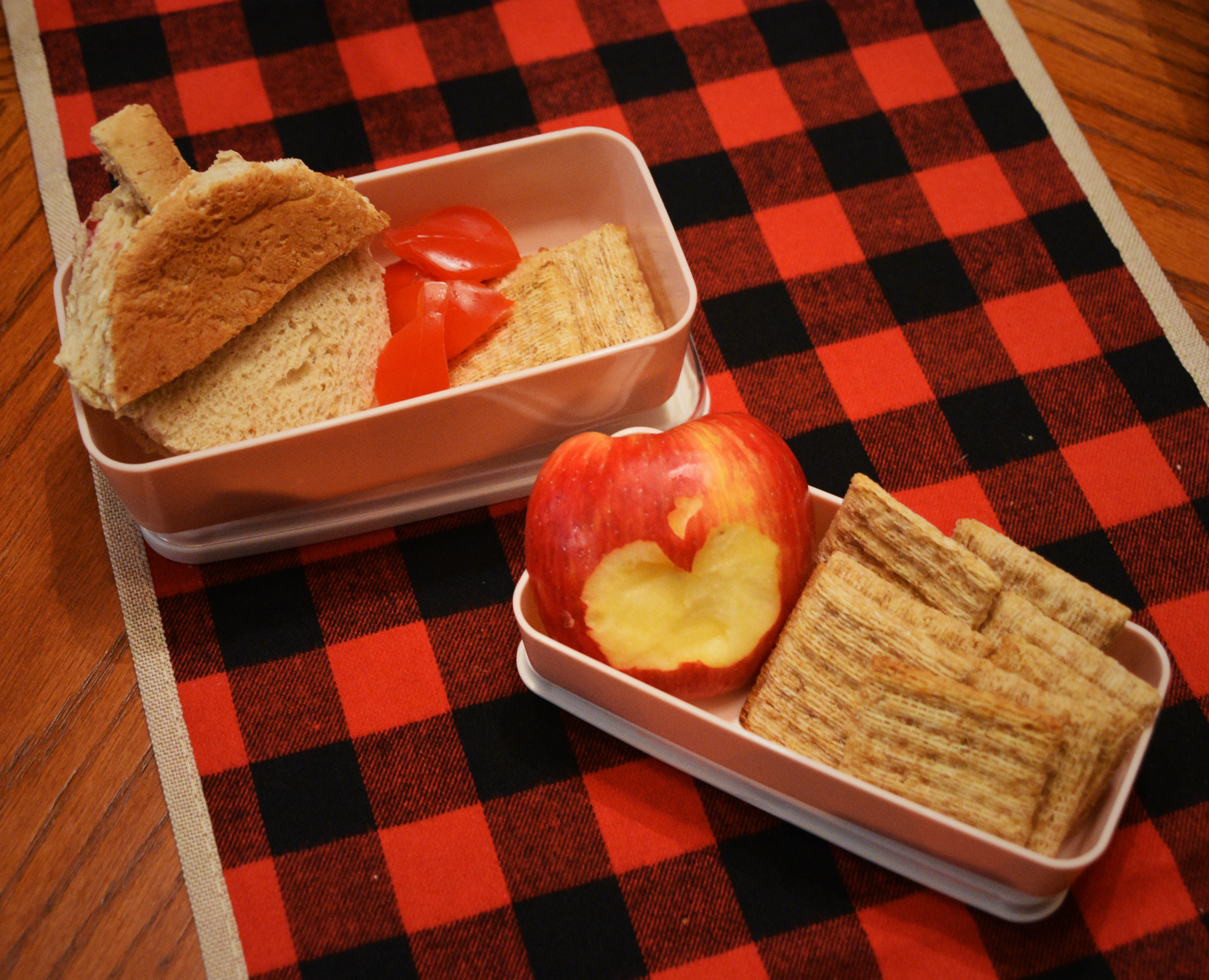Finally, arrange each element into a lunch box. On one side, add a desired crunchy snack like pita chips, crackers or pretzels.