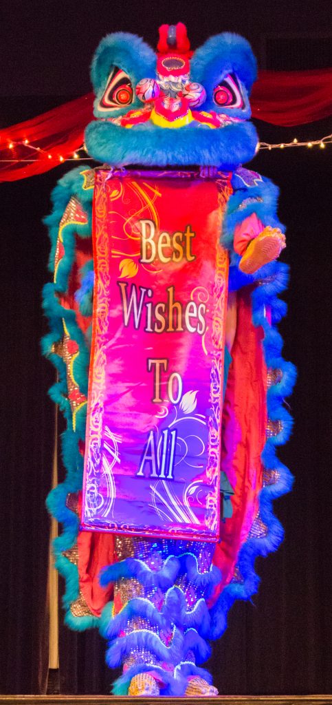 Having thoroughly packed the room and fed their guests an authentic Chinese dinner, the organizers of the event started off the night’s performances with a lion dance by visiting performers from White Lotus Crew in Portland. Emerging from the back of the room, the two lions made their way into the room while dancing and interacting with the crowd. They launched oranges and lettuce out at the audience, and their performance concluded with confetti and banners saying, “Happy New Year” and “Best Wishes To All.”